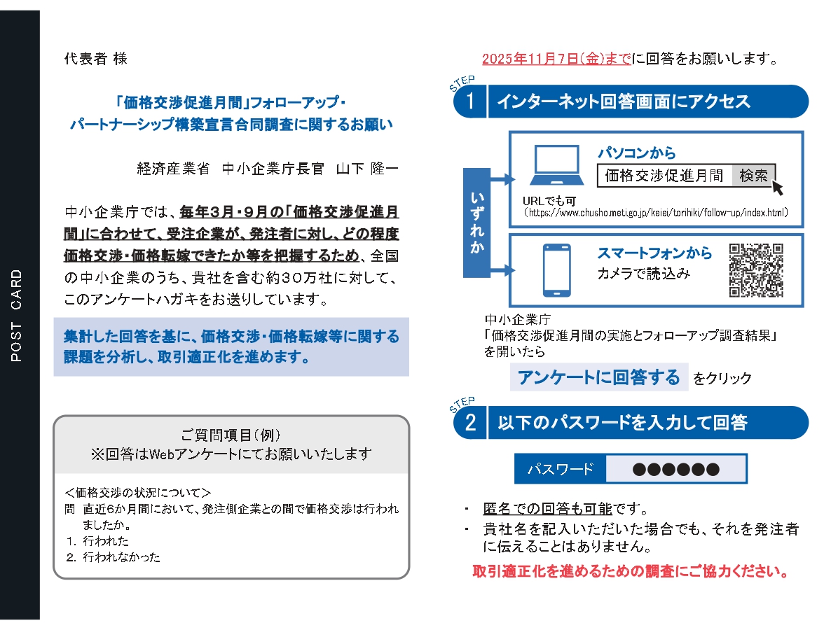 価格転嫁が実現されやすい環境を作り上げていくためには、多くの中小企業のご意見をいただき、現状を正確に把握することが重要ですので、中小企業庁からはがきを受領した法人企業は調査へのご協力くださいますようお願い申し上げます。