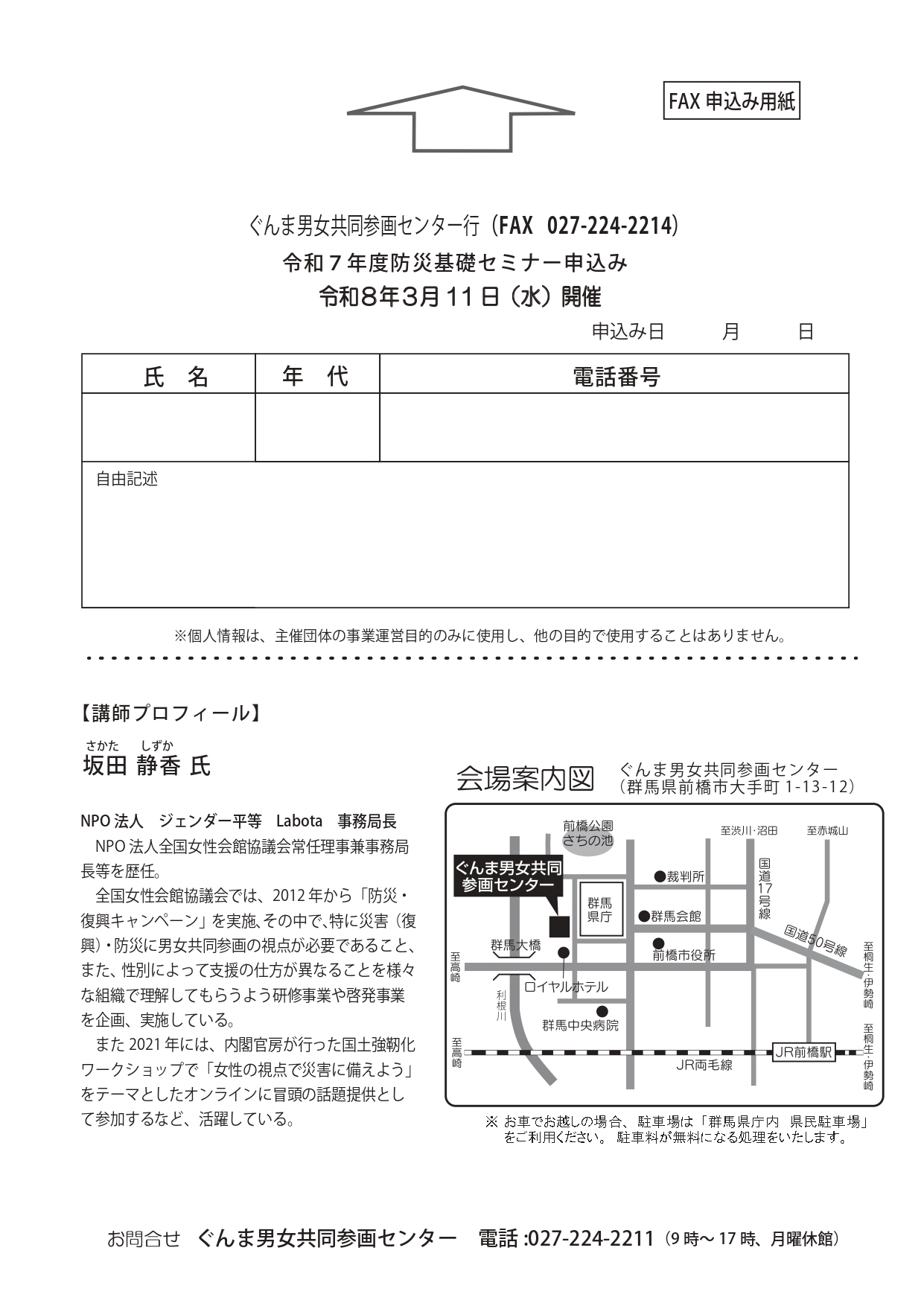 群馬県生活こども課男女共同参画室・ぐんま男女共同参画センター主催 とらいあんぐる防災基礎セミナーが開催されます。参加を希望される方は、下記申込用紙にご記入のうえお申込みください。