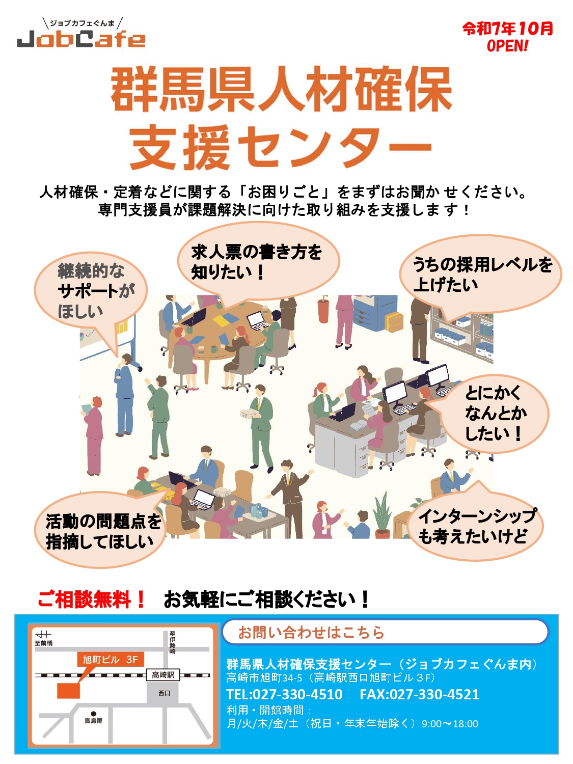 ジョブカフェぐんま内に企業向け人材確保相談窓口として、令和7年10月に新しく群馬県人材確保支援センターが開所されましたのでご活用ください。