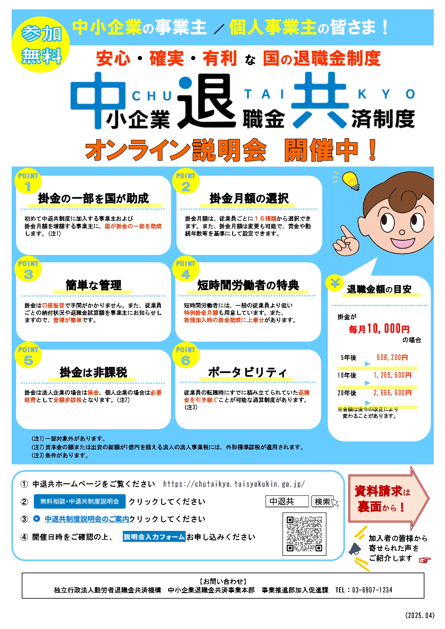 独立行政法人勤労者退職金共済機構主催 中小企業退職金共済制度に関するオンライン説明会が開催されます。