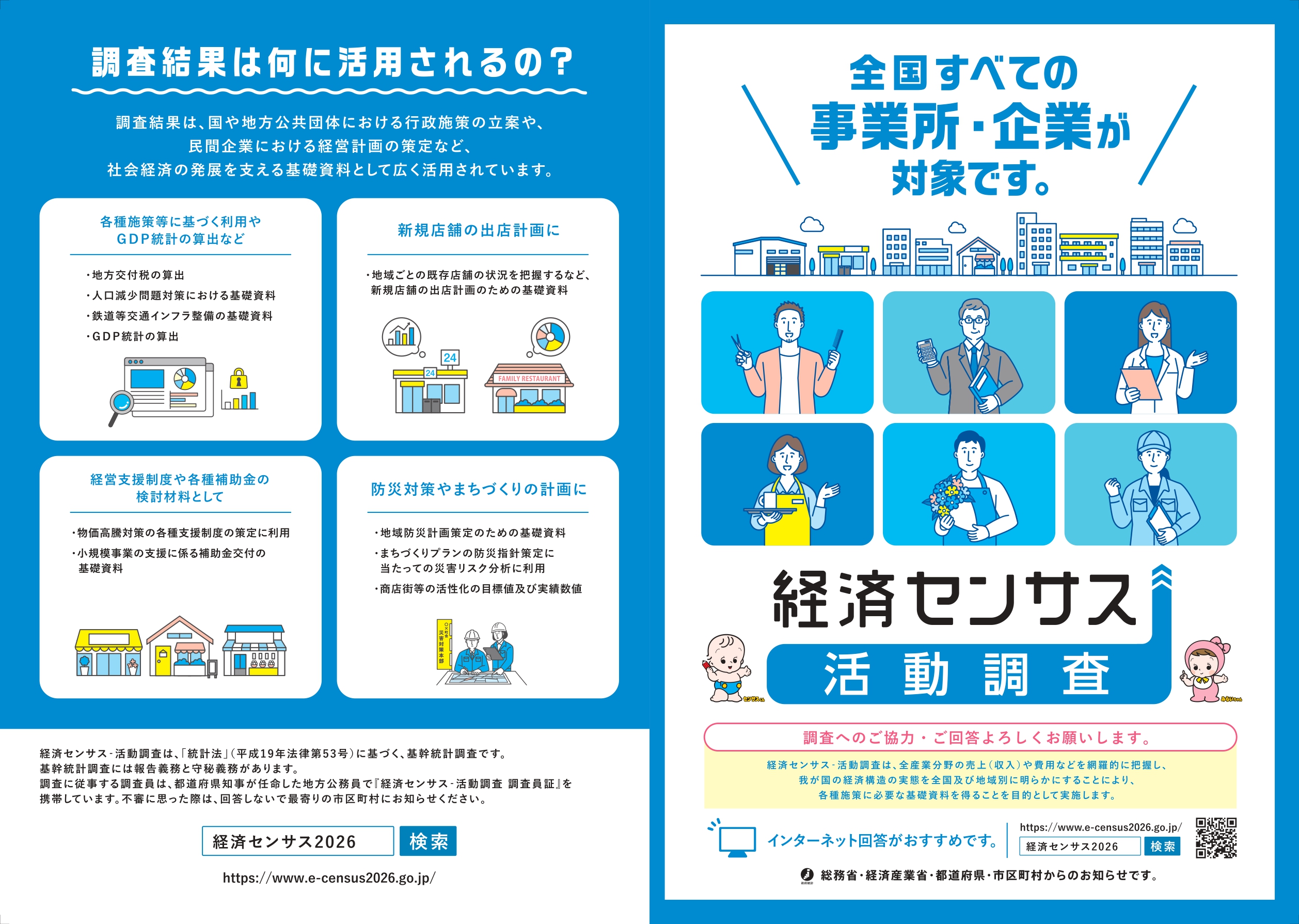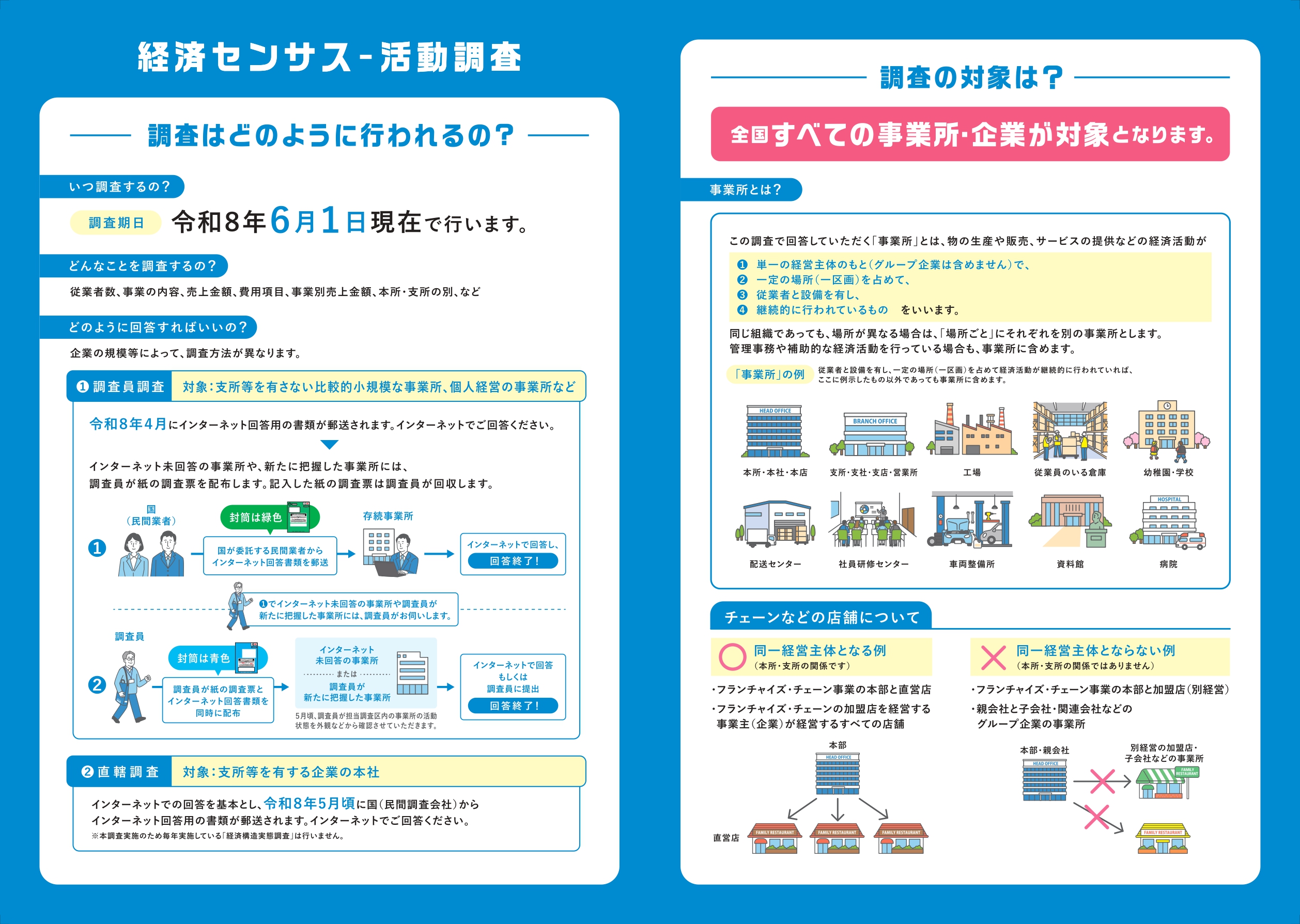 総務省・経済産業省では、令和8年6月1日現在で、全国のすべての事業所・企業や団体を対象とした「令和8年経済センサス-活動調査」を実施します。